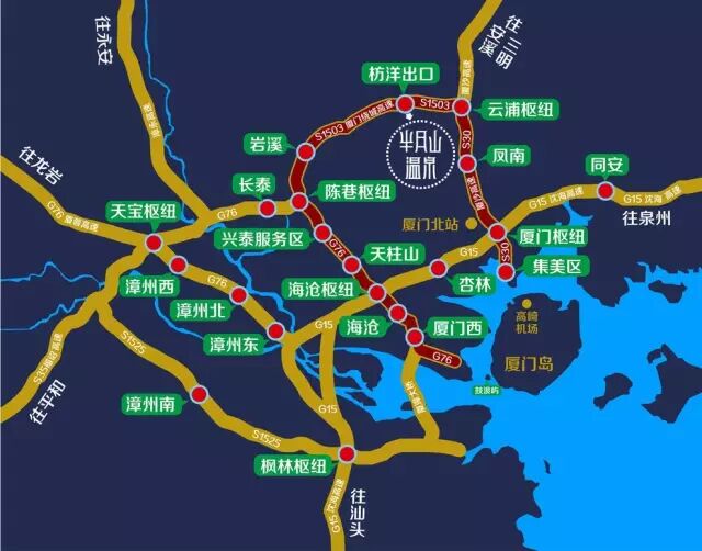 从上图看可以清楚看到半月山处于厦门绕城高速圈内,这个高速圈西接龙岩G76厦蓉高速陈巷枢纽,南接沈海高速海沧枢纽,东接沈海厦门枢纽,北接厦沙高速云浦枢纽。那下面我们一个个解说一下。